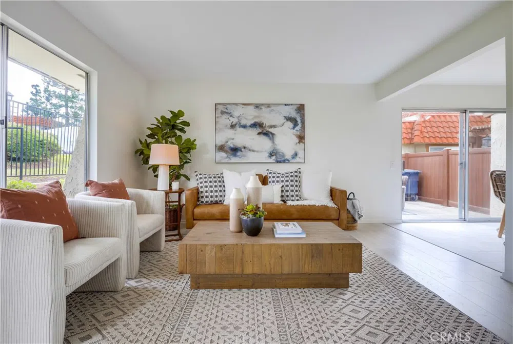 Prepare to fall in love with this beautifully updated and improved single level end unit with gorgeous new upgrades throughout! This beauty lives like a single-family residence with a highly desirable greenbelt location ideally situated in the Rancho Viejo Condos community within walking distance of local schools, dining, shopping, and recreation. Step inside and soak in the light filled freshly painted interior with scraped ceilings and sleek luxury vinyl plank flooring, all setting the stage for an ideal living environment. The spacious living area opens to the dining room with direct access to the enclosed patio creating a superb indoor-outdoor living space. The light and bright Kitchen has been beautifully updated with new white shaker cabinetry, sparkling Quartz countertops, new Stainless pull-down faucet, new disposal, new Stainless-Steel appliances including a new oven with gas cooktop, over-stove external vented microwave, a new dishwasher, and an abundance of storage and countertop space. The primary bedroom suite is a tranquil retreat which includes a private updated bathroom with new vanity lighting and a newly re-glazed walk-in shower. This well-designed floor plan also includes two spacious secondary bedrooms, an updated full guest bathroom, linen cupboards, and a large laundry closet with shelving and hookups for full size washer and gas dryer. Additional improvements include newer Water Heater installed in Nov 2022, Furnace motor replaced 2024, AC Capacitor replaced 2024, and repiped with Pex Plumbing in 2019. The prized fully enclosed outdoor patio is a private oasis with water-conscious landscaping, new outdoor lighting, and vinyl fencing, a perfect space for relaxing and entertaining with friends and family. 1 Car garage included with built-in storage shelving, a new garage door opener installed in 2019, plus an additional uncovered assigned parking space located directly in front of the garage. This home is conveniently located just steps away from the community pool area and basketball courts. Close to local parks, schools, Orchard Shopping Center, easy 5 Frwy access, and just minutes from local beaches!